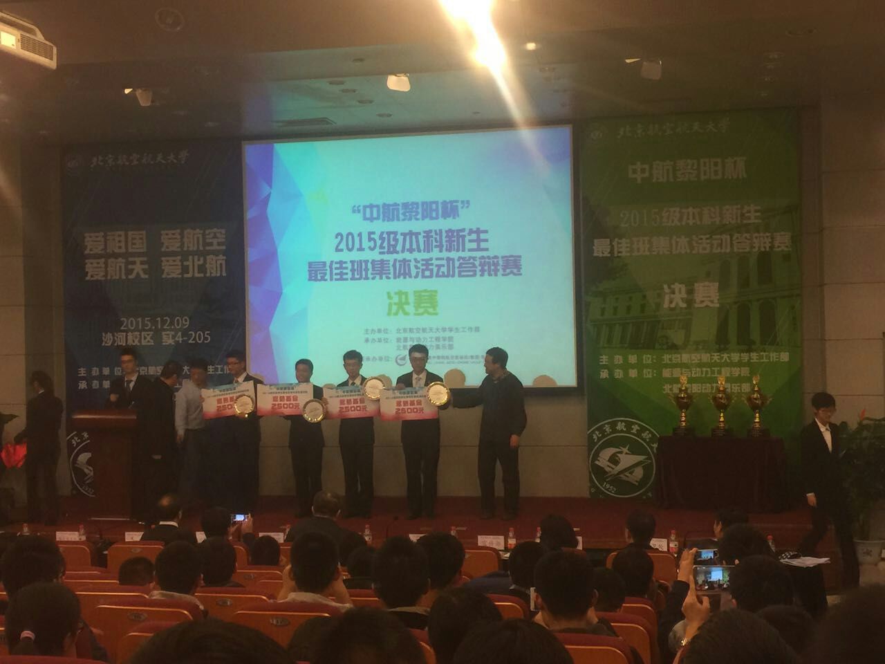 2015年12月9日晚上18:30-10:00,在沙河校区四号实验楼205举行了“中航黎阳杯”2015级本科新生最佳班集体活动答辩决赛。151911班从参加决赛的14个班级中脱颖而出,荣获二等奖。