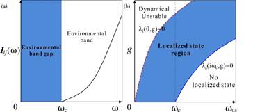 图3. (a)具有带隙结构的环境谱;(b)系统中的局域模式分布
