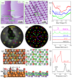 图注:a与b,二维锡烯的大尺度及原子尺度形貌图;c,STS谱;d与e,锡实验及模拟LEED图;f,Raman谱;g,原子结构模型;h,电荷差分密度图;i,振动态密度图。