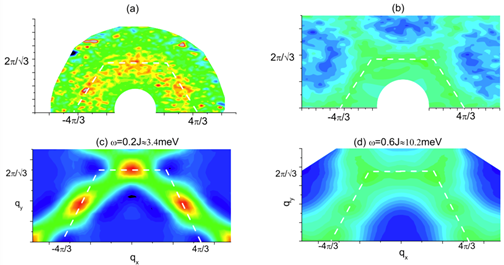 | 图例:自旋液体材料Herbertsmithite非弹性中子散射谱与kagome Heisenberg自旋系统动力学结构因子数值结果的比较 |