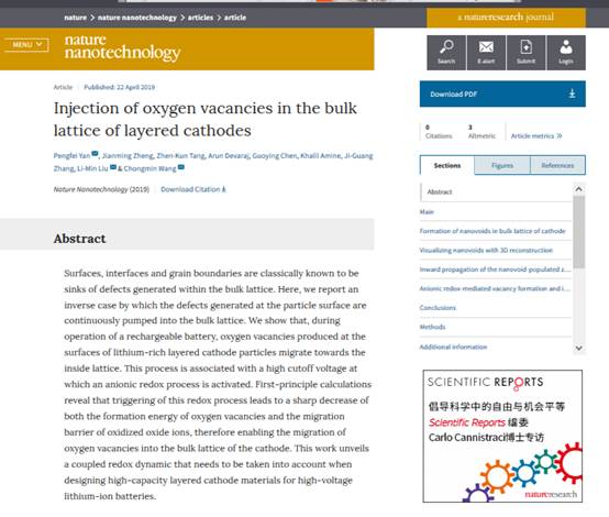 北京时间4月22号Nature Nanotechnology以“Injection of oxygen vacanciesin the bulk lattice of layered cathodes”为题在线发表了层状金属氧化物领域取得的研究成果,文章通过实验和理论计算发现氧离子在层状氧化物材料中的扩散和激活比现有的认知更容易。