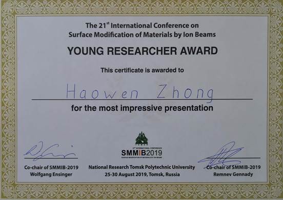 在2019年8月25日至30日于俄罗斯托木斯克市举办的第21届国际离子束材料表面改性大会(The 21th International Conference on Surface Modification ofMaterials by Ion Beams, SMMIB 2019)上,pg娱乐电子游戏官网入口强脉冲粒子束实验室的博士生钟昊玟同学同来自俄罗斯、法国和南非的5名青年学者一道获得了本次会议的青年研究者奖。