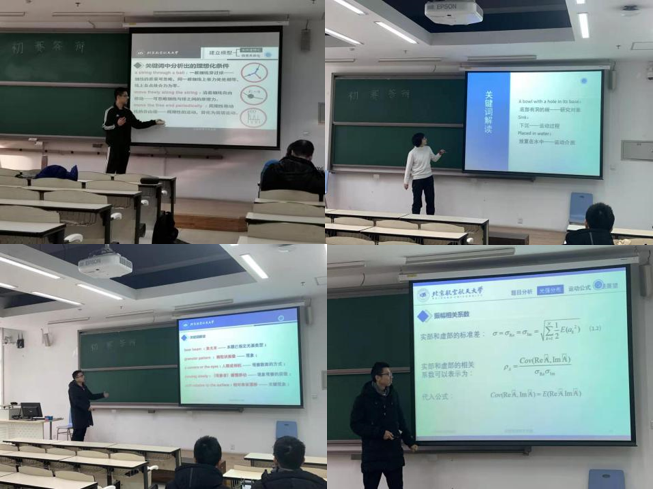 11月30日,答辩在沙河校区两个教室同时进行。每一位参赛选手有10分钟的时间展示自己的研究成果,包括题意重述、原理分析、实验验证以及下一步的研究计划等等。选手展示结束后,有2分钟的时间评委向答辩选手提出问题以及一些改进的建议。最后,每位评委老师会亮出自己的评分,并有评委进行点评。