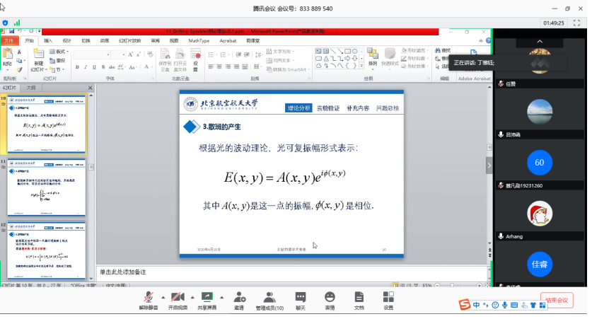 线上交流于4月18日下午13:00开始,借助腾讯会议平台,八支参赛队伍按照顺序依次进入会议报告本队伍的阶段性成果。物理学术竞赛要求参赛队伍对给出的题目进行合理的理论分析,并进行实验验证,然而由于目前同学们不能返校,实验条件有限,各队伍只概要地阐述了自己对题目理论性的建模及分析。参加会议的老师与社团成员给参赛队员们指出问题,提出了建设性意见,也不时对队员们做的好的地方提出表扬。同时,队员们也同老师和社团成员们积极交流,提出了一些自己在题目理解、实验准备上遇到的问题,老师和社团成员们则仔细解答。大家热情高涨,原定大约两小时的会议持续了大约四小时。