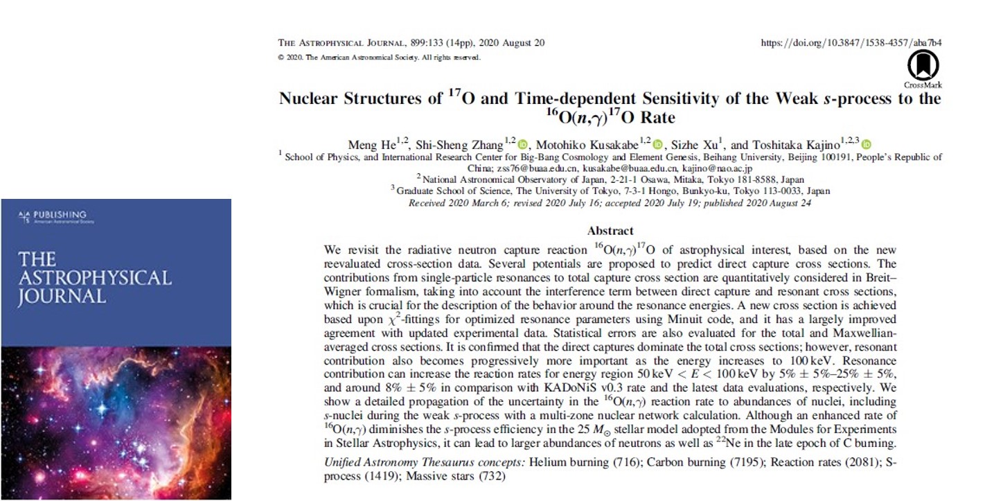 近日,国际天体物理知名期刊《The Astrophysical Journal》在线刊登了我校pg娱乐电子游戏官网入口2017级硕士研究生贺萌(第一作者)及其导师张时声副教授(通讯作者)、日下部元彦副教授、许思哲、梶野敏贵教授,在大质量恒星演化过程研究方面的最新进展:《Nuclear Structures of17O and Time-dependent Sensitivity of the Weak s-process to the16O(n,γ)17O Rate》。(论文链接:https://iopscience.iop.org/article/10.3847/1538-4357/aba7b4)
