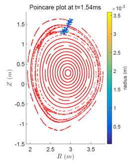 托卡马克位形是目前最有希望实现商用聚变能源的磁约束聚变位形。在托卡马克装置运行过程中,由于等离子体自发的不稳定性或者外界因素的影响,托卡马克等离子体可能会出现所谓的破裂现象。在这一过程中等离子体中存储的能量会快速、局域地沉积到装置面等离子体材料上,对其造成严重的损伤,甚至危及装置的持续运行。因此,对破裂事件的防护与缓解机制的研究是稳定、可持续的聚变能源能否实现重中之重。胡地博士采用理论与数值模拟并重的方法开发了研究基于大量粒子注入实现破裂防护的大规模数值模拟模块,并与合作者在这方面展开了系统的研究。研究发现注入粒子会导致在安全因子为有理数的磁面上产生螺旋形的冷却结构并导致相应的螺旋对称电流密度扰动,从而导致与该磁面共振的电流驱动磁流体不稳定性解稳。失稳的宏观磁流体模式又会反过来强化注入粒子的输运,增加注入粒子的穿深,有助于注入粒子均匀地分布在等离子体中从而提高破裂防护的效率。