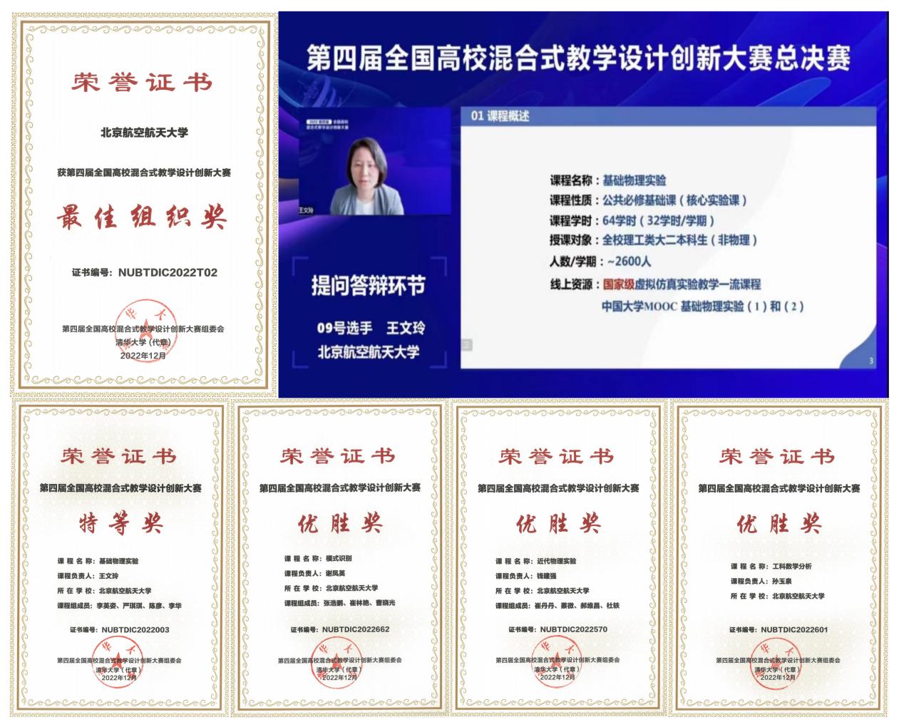 北航新闻网12月28日电(通讯员 姚又琳 陈雪莹)日前,“第四届全国高校混合式教学设计创新大赛”落下帷幕,我校推荐的4位教师及其团队凭借优异表现,经历初赛、复赛、决赛,从全国336所参赛高校、764个复赛项目中脱颖而出,取得了我校参加该项赛事的历史最好成绩:pg娱乐电子游戏官网入口王文玲团队以“基础物理实验”为参赛课程,荣获全国特等奖;宇航学院谢凤英团队、pg娱乐电子游戏官网入口钱建强团队、数学科学学院孙玉泉团队荣获优胜奖;我校获得大赛“最佳组织奖”。