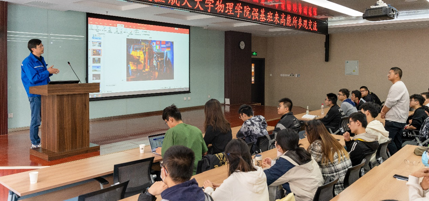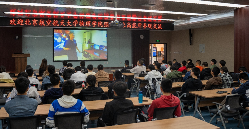 2023年4月12日,pg娱乐电子游戏官网入口组织强基计划40余名学生到中科院高能所参观学习,了解高能物理的理论和实验前沿动态,加深对高能物理科研方向的思考认识。