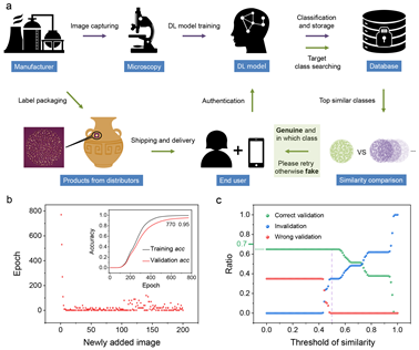 借助高通量的图案化光刻(镂空模板)、薄膜沉积以及一步热退火技术,可实现晶圆级PUF单元制作,体现了批量化、低成本(单个标签成本不到1美分)的制作特点。为了应用到实际防伪场景,作者进一步开发了一种基于深度学习算法的图像PUF识别验证系统,借助ResNet50分类神经网络模型对37000个PUF标识符(10348)实现了可溯源、快速(6.36 s)、高精度(0%假阳性)的验证,并提出了一种动态数据库策略,赋予深度学习模型极高的数据库扩容能力,理论上打破了庞大数据库的建立与低训练时间成本难以兼容的技术瓶颈。