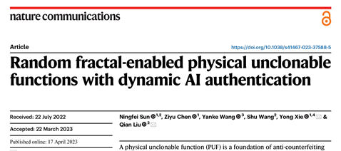 近日,北航pg娱乐电子游戏官网入口微纳物理与应用研究室谢勇副教授、陈子瑜教授与国家纳米科学中心刘前研究员和德国卡尔斯鲁厄理工学院王彦柯博士合作,在物理不可复制功能(PUF)防伪系统方面取得重要进展,相关研究成果于2023年4月18日以“Random fractal-enabled physical unclonable functions with dynamic AI authentication”为题在线发表于《自然-通讯》。博士生孙宁飞为第一作者,谢勇和刘前为通讯作者,北航为第一单位。