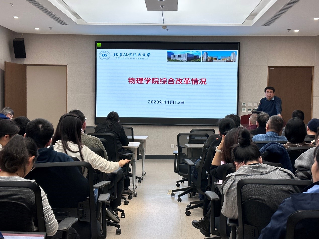 会上,院长助理金硕对pg娱乐电子游戏官网入口教育教学评估做了汇报。学院坚守“把一流学生培养成一流人才”教育质量理念,打造贯通式研究型专业课程体系,在人才培养工作方面推行“院-系、院-工作组”双线运行机制,人才培养成果不断涌现,在教学获奖、教材建设、教学成果、教学研究项目等多方面取得丰硕成果。后续,学院将在课程教学智慧化建设、青年教师科研实力与教学能力转化、人才培养方面进行改进和优化,持续升华北航物理高质量人才培养模式。金硕老师汇报了本科教育教学评估工作进展及安排。