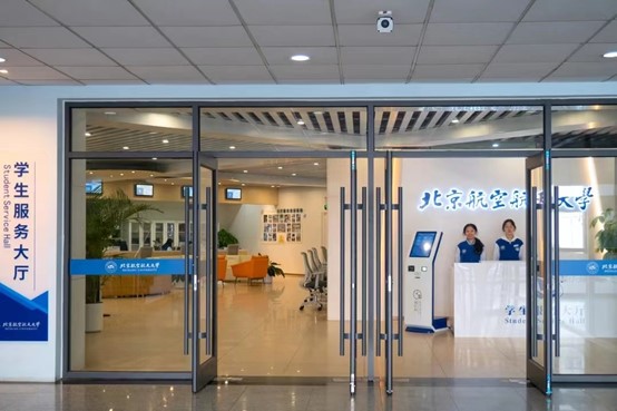 “一窗式”服务模式不只为学生提供优质服务,还坚持服务育人和劳动育人。学生服务大厅招募培训136名学生助理,建立4级运营队伍体系,现已实现由“部门服务学生”向“学生服务学生”转变,引导学生自我教育和自我服务。学生服务大厅在空间建设上注重弘扬以“空天报国”为内核的北航精神,在工装、墙标、胸牌、宣传栏、服务台、文化角等设计上也彰显学校文化特色,通过营造校园文化氛围,增强学生对学校的认同感、归属感。