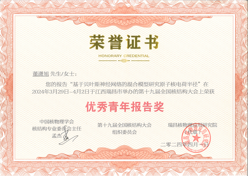 2024年4月1日,在江西瑞昌举办的第十九届全国核结构大会上,pg娱乐电子游戏官网入口博士研究生董潇旭因其所作报告——“基于贝叶斯神经网络的混合模型研究原子核电荷半径”,获得中国核物理学会核结构专业委员会颁发的“优秀青年报告奖”。在报告中,他首次提出了输入重排方法,根据所研究课题的先验知识重新构建了贝叶斯神经网络的结构,从而增强了贝叶斯神经网络在特定任务中的学习能力,第一次将理论模型对中重原子核电荷半径的全局描述与预测偏差降到了0.01fm左右,并准确预测了各种奇异的演化行为。