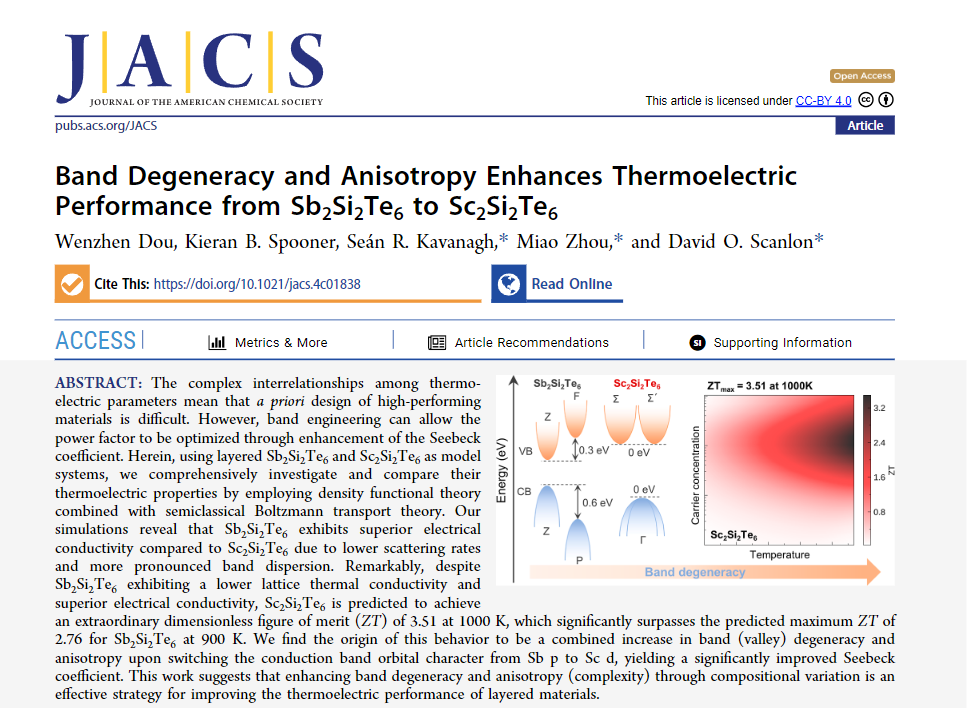 近日,北航pg娱乐电子游戏官网入口周苗教授与合作者在层状化合物热电材料的理论设计方面取得重要进展,相关成果以“Band Degeneracy and Anisotropy Enhances Thermoelectric Performance from Sb2Si2Te6 to Sc2Si2Te6”为题在《Journal of the American Chemical Society》上发表。