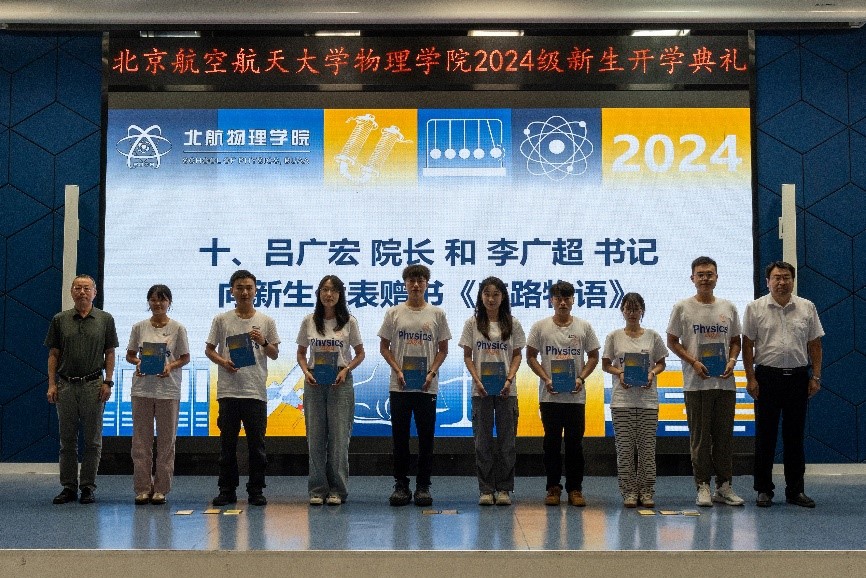 典礼最后,吕广宏院长、李广超书记向新生代表赠书《航路物语》,勉励同学们从中深刻体会北航物理的精神文化,不断汲取奋斗动力,传承好北航物理精神。