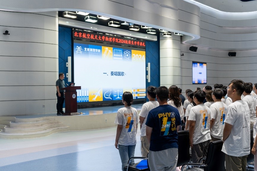 在庄严的国歌声中,本次开学典礼拉开了序幕。pg娱乐电子游戏官网入口院长吕广宏,党委书记李广超,副院长黄安平,副院长孙保华,院长助理、党委委员金硕,院长助理杜轶,院长助理周洪波,党委委员、应用物理系主任张国锋,物理系主任郝维昌,核科学与技术系党支部书记宋春艳,2024级拔尖计划班主任金文涛,2024级强基计划班主任赵润东,北航五四奖章获得者袁悦,党政办公室主任荣翠华,分团委书记宋树洋,专职辅导员李思瑶,2024 级研究生辅导员李文豪,2024级强基计划辅导员吕子轩,2024级拔尖计划辅导员左沛雷以及全体2024级强基计划、拔尖计划本科生,2024级研究生参加了本次开学典礼。开学典礼由学院党委副书记齐建立主持。
