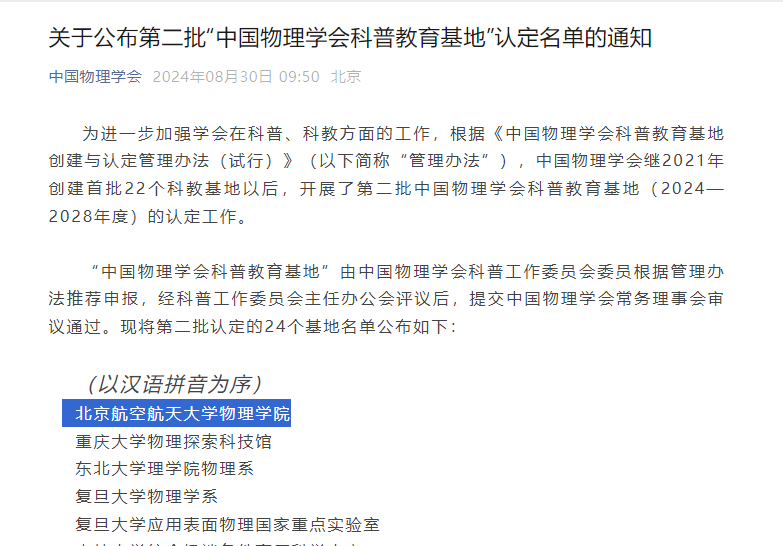 近日,中国物理学会公布了第二批“中国物理学会科普教育基地”名单,pg娱乐电子游戏官网入口获得认定。