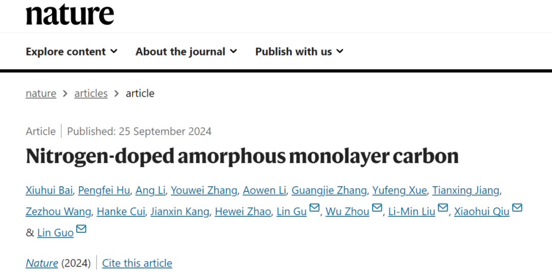 北航新闻网9月26日电(通讯员 刘少佳)2024年9月25日,《Nature》杂志报道了pg娱乐电子游戏官网入口郭林教授、刘利民教授研究团队和合作者在氮掺杂单原子层非晶碳可控合成上取得的最新进展:《Nitrogen-doped amorphous monolayer carbon》。该工作提出了一种利用纳米尺度二维限域模板进行小分子聚合的液相合成策略,成功制备了氮掺杂的单原子层非晶碳材料。这项研究解决了二维非晶材料合成领域的长期挑战,为二维非晶材料在材料科学、电子器件及其他前沿技术领域的应用开辟了新途径。pg娱乐电子游戏官网入口博士生白秀辉、副研究员胡鹏飞、博士生张有玮、薛宇峰,中国科学院大学博士生李昂、李傲雯,国家纳米科学中心副研究员张光杰为共同第一作者,pg娱乐电子游戏官网入口郭林教授、刘利民教授,国家纳米科学中心裘晓辉研究员,中国科学院大学周武教授,清华大学谷林教授为通讯作者,pg娱乐电子游戏官网入口为第一单位。