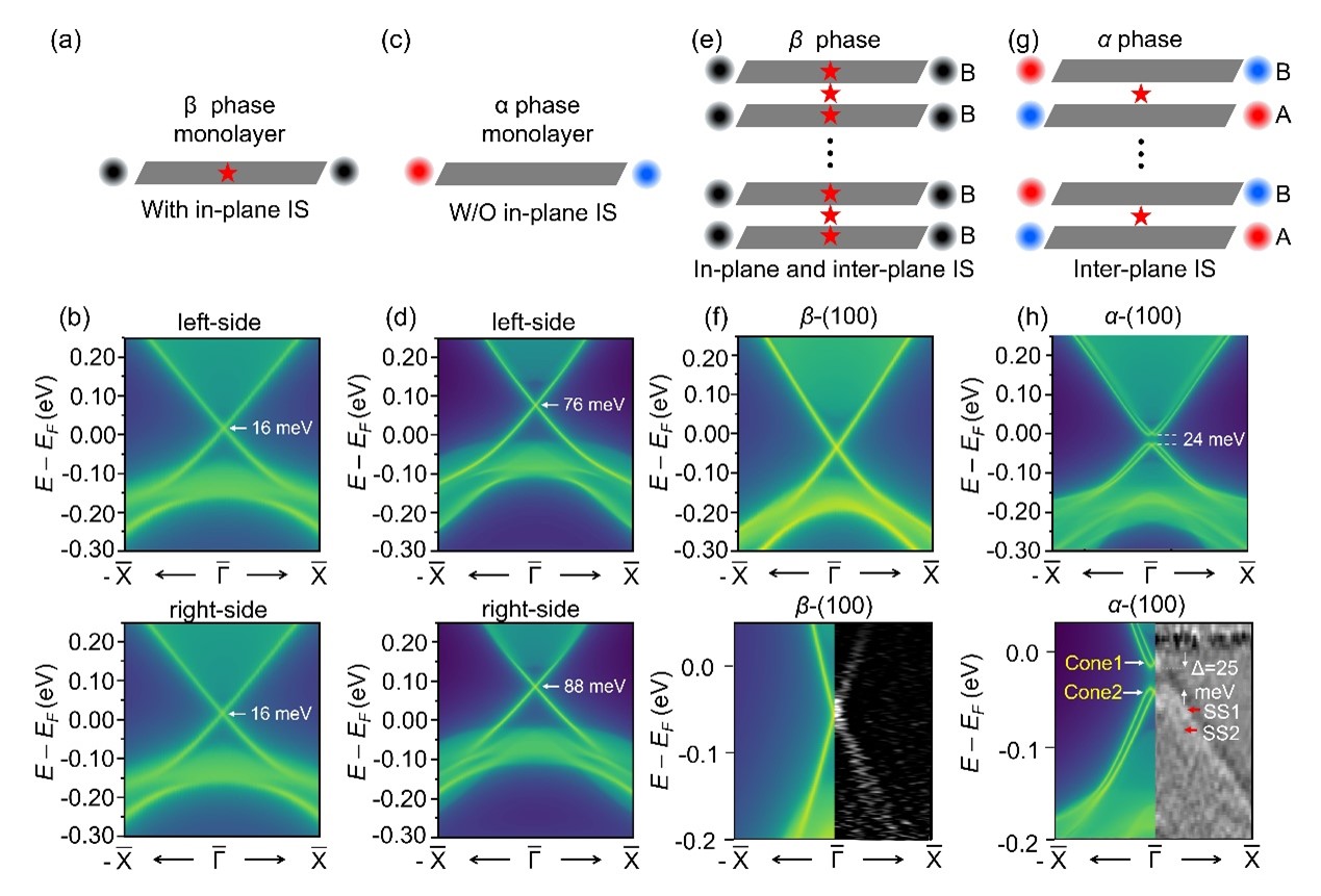 在本项工作中,研究团队发现在Bi4I4这个材料中,随着温度的下降存在结构相变,进而导致对称性降低,即自发对称性破缺现象。这种自发对称性破缺会导致单层的量子自旋霍尔绝缘体中原本简并的拓扑边界态变为非简并状态(如图c所示)。把这些具有非简并边界态的量子自旋霍尔绝缘体按照具有层间反演中心的形式进行范德华堆垛形成三维材料,非简并的边界态会沿着面外方向交替排列排列(图g),由于层间耦合作用,非简并的边界态会在能带相交处耦合打开能隙,进而产生有质量的狄拉克费米子。
