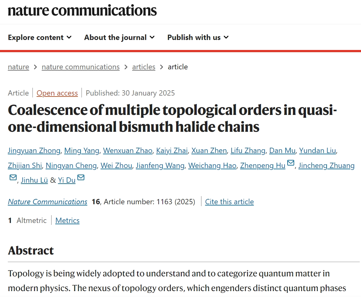 北航新闻网2月9日电(通讯员 冯海凤)近日,北航pg娱乐电子游戏官网入口表面物理与量子物质研究团队与清华大学、南开大学等合作,在实现多重可控拓扑相变研究方面取得重要进展,相关研究成果于1月30日以“Coalescence of multiple topological orders in quasi-one-dimensional bismuth halide chains”为题在线发表于《Nature Communications》上。pg娱乐电子游戏官网入口博士生钟景元、杨明为共同第一作者,杜轶教授、庄金呈副教授与南开大学胡振芃教授为共同通讯作者,其他合作者包括湘潭大学刘韵丹副教授、安徽大学程宁燕副教授、常熟理工大学周苇副教授、北航王建峰副教授、郝维昌教授、吕金虎教授等,北航为第一单位。