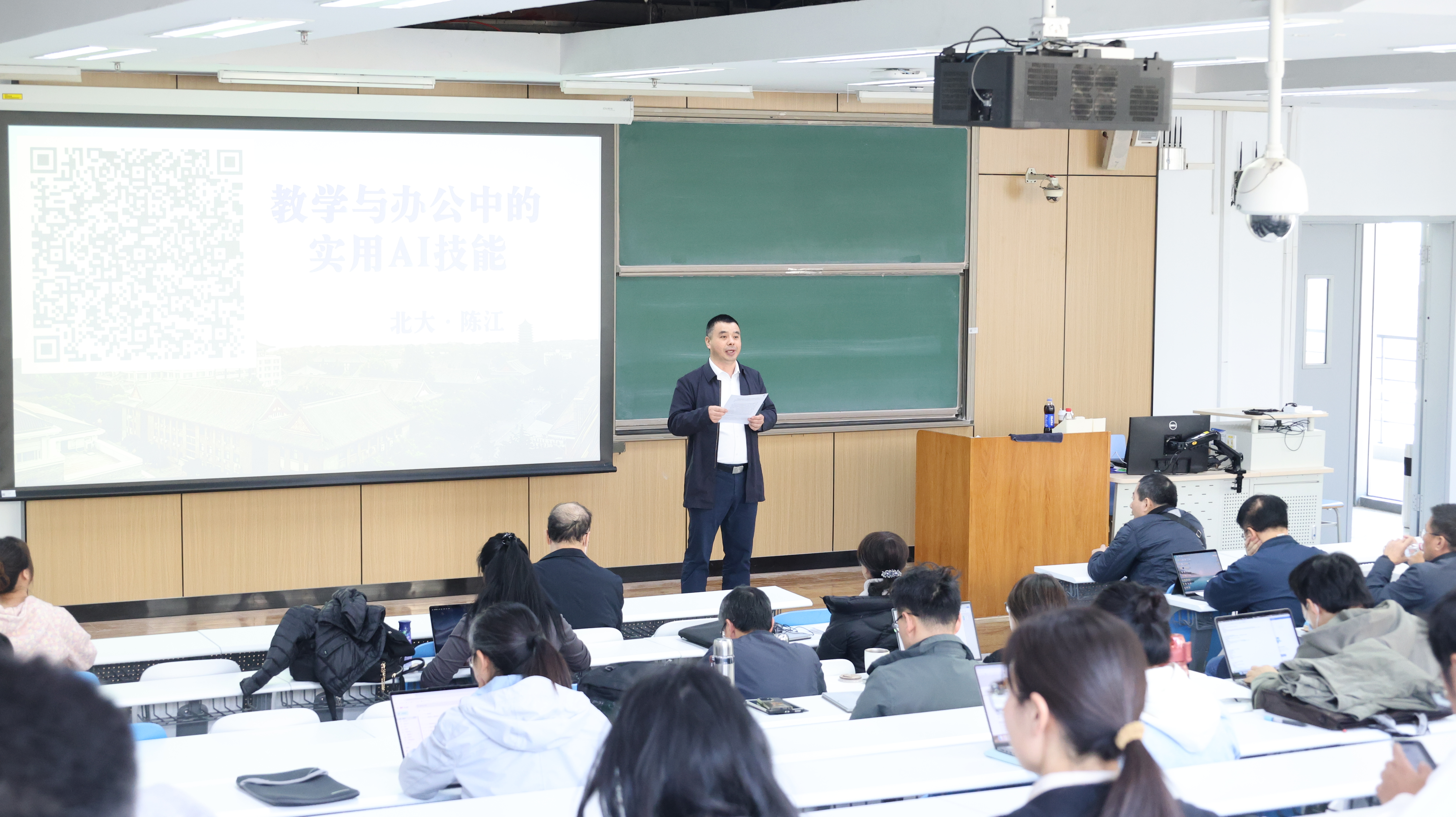 北京大学信息科学技术学院陈江教授为参会教师做了主题培训,题目为“实用AI技能赋能教育教学变革实操工作坊”。陈江教授从ChatGPT、DeepSeek等AI新技术带来的变革为切入点,现场演示AI技术与各类常用办公软件结合应用的实操效果,展示人工智能如何深度融入教学全过程,从备课、授课到作业批改,全面助力教师提升效率,打造个性化课堂。陈江教授用“一个极速前进+无人能挡+可以乘坐”的黑盒子来形象描述“AI到底是什么”,建议教师们从"观望者"转变为"驾驭者",用AI黑盒子的强大动力重构课堂生态,让技术真正服务于人的成长。