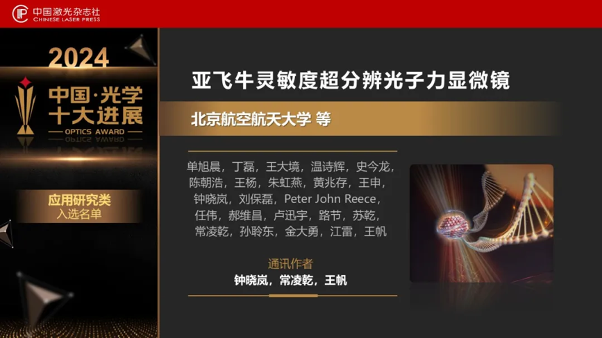 3月29日晚,中国激光杂志社发布2024中国光学十大进展。pg娱乐电子游戏官网入口王帆、钟晓岚团队及合作者的“亚飞牛灵敏度超分辨光子力显微镜”入选2024中国光学十大进展(应用研究类)。