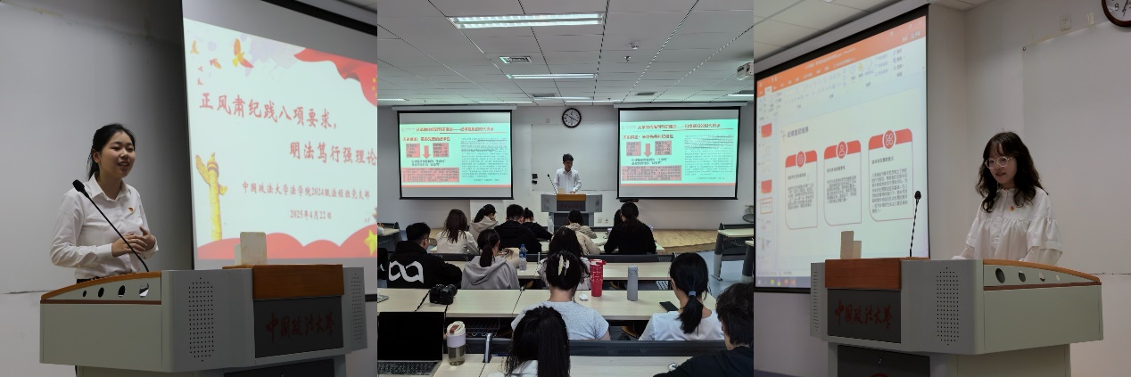 下午,三支部在中国政法大学开展中央八项规定精神与科研诚信融合研讨。中国人民大学法学院2024级法律硕士三支部书记黄靖茹以《八项规定:青年党员成长的时代指引》为题,通过剖析杨某违规收受茅台司法案例,揭示“四风”问题在学术领域的隐形变异形态。中国政法大学法学院2024级法经班书记黄含域以《正风肃纪践八项要求,明法笃行强理论根基》为题,基于中央八项规定出台以来138个月报数据,系统论证作风问题与党性修养的深层联系。物理系硕士第二党支部书记吴家超以《中央八项规定精神与科研诚信的融合》为题,阐释“改进调查研究”“精简会议活动”等规定在科研管理中的具体转化路径。随后,同学们展开热烈讨论,纷纷表示要将中央八项规定精神内化为学术自律准则,在科研实践中自觉抵制学术不端行为。