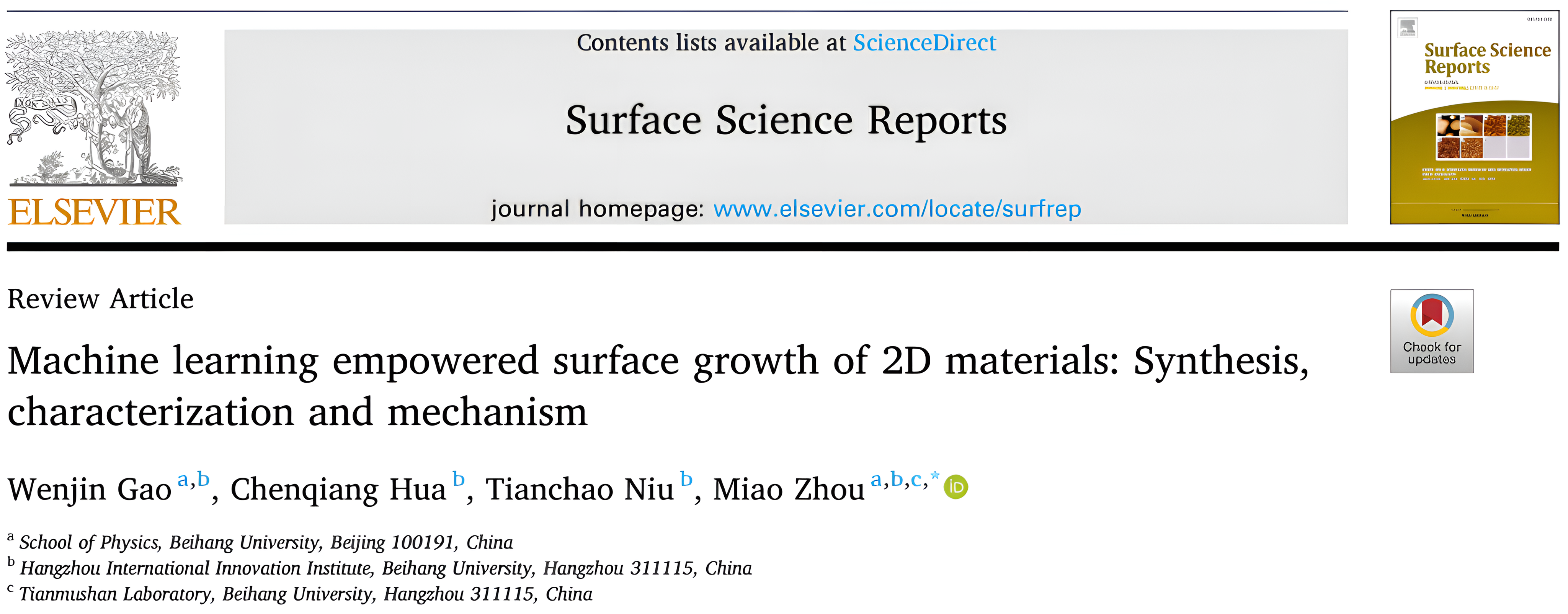 近日,北航pg娱乐电子游戏官网入口周苗教授团队应邀撰写的综述“机器学习赋能二维材料表面生长:合成、表征与机理”(Machine learning empowered surface growth of 2D materials: Synthesis, characterization and mechanism)在线发表于表面科学领域的顶级综述期刊Surface Science Reports。