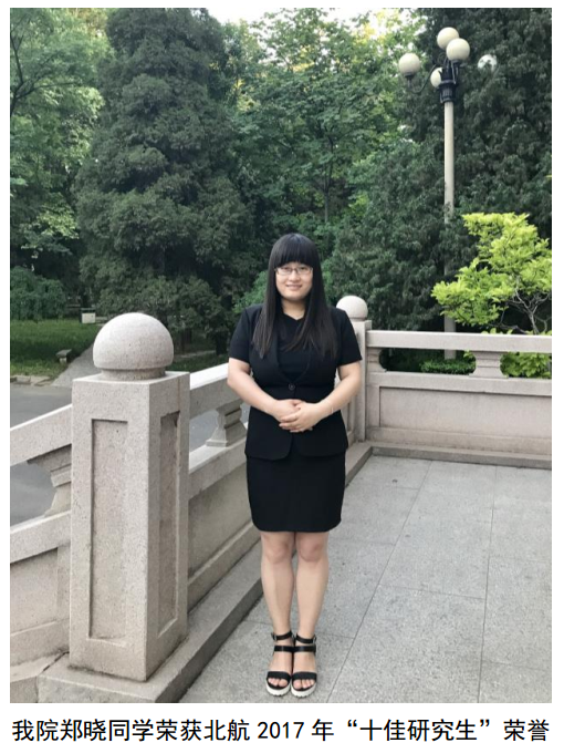 北航“研究生十佳“评选活动是研究生院为了进一步加强研究生学风建设,营造良好的学术氛围,面向全校研究生开展的优秀研究生表率评选活动。经过本年度学院初评和校级复评,我院硕士研究生郑晓同学以优秀的个人表现、突出的成绩脱颖而出,荣获“研究生十佳”称号。