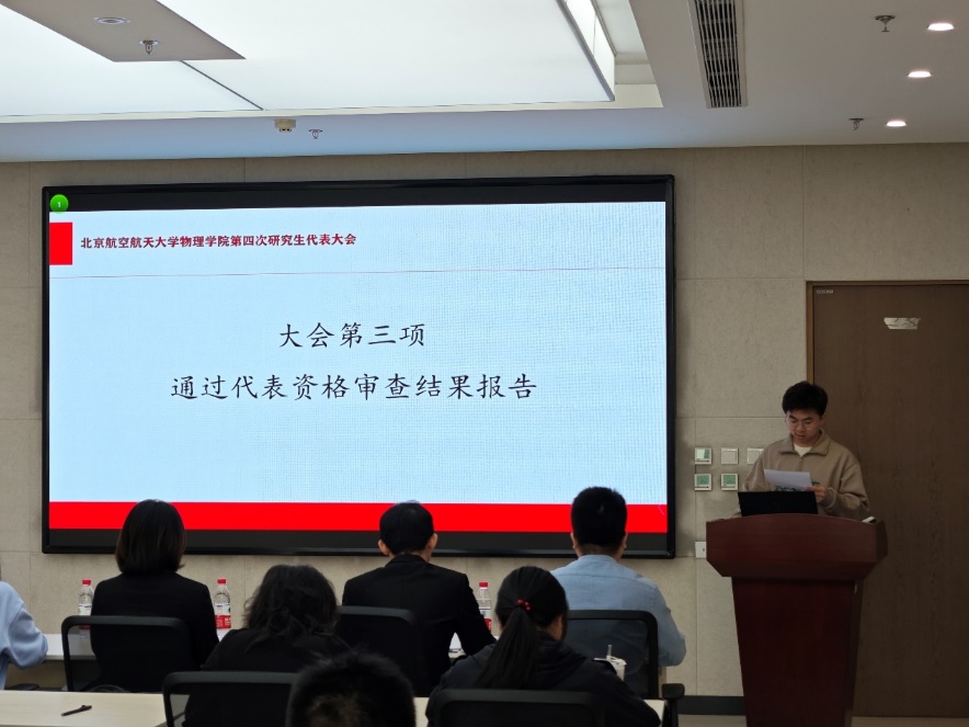 会议期间,pg娱乐电子游戏官网入口研究生会刘丁旭宣读了《pg娱乐电子游戏官网入口第四次研究生代表大会资格审查报告》,该报告获得与会代表审议通过。