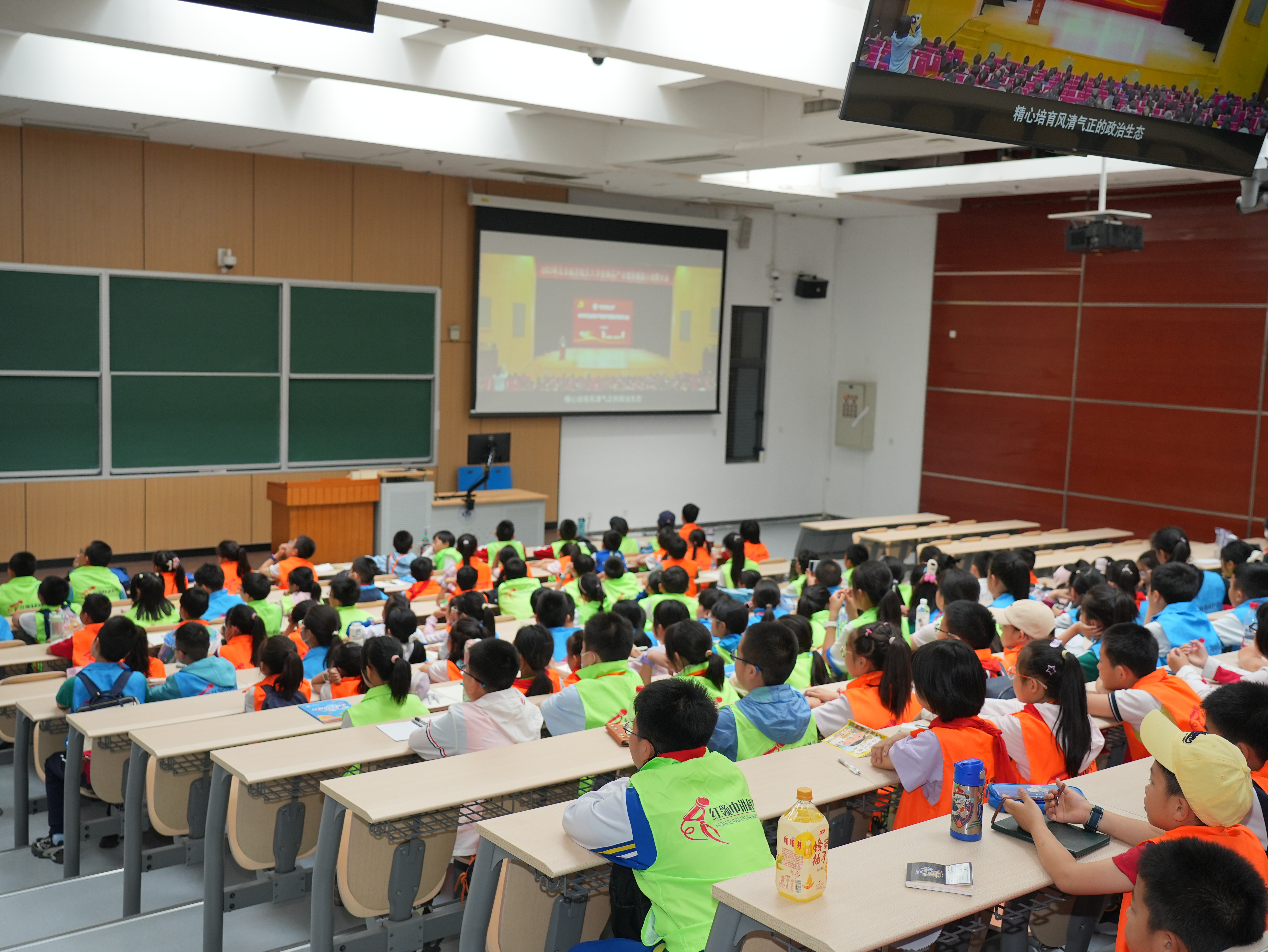 中午,支部党员身着统一志愿者服装,抵达校门口集合。在专职辅导员的统筹下,党员们分工协作,有序引导载满小学生的大巴车进入校园,全程维护上下车秩序与行进安全。孩子们佩戴的红领巾与党员胸前的党徽交相辉映,成为校园一道亮丽风景线。