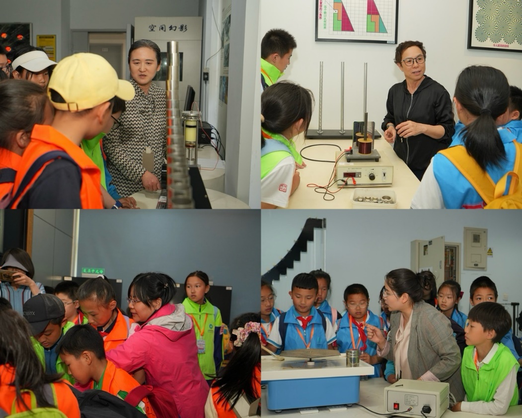活动最后一站来到物理教学与实验中心。沈嵘、赵素芬、王菁、崔丹丹四位老师分别在力、振动与波,电磁学,光学,近代与综合演示室为孩子们带来精彩演示。光学干涉仪绚丽的条纹、超导磁悬浮演示等实验引发阵阵欢呼。孩子们围在展台前,睁大眼睛听老师讲解实验原理和应用场景,面对一台台“看得见摸得着”的科学装置,孩子们踊跃提问,现场互动频繁。这次“近距离接触科研”的经历,让孩子们深刻感受到科学的真实与魅力。