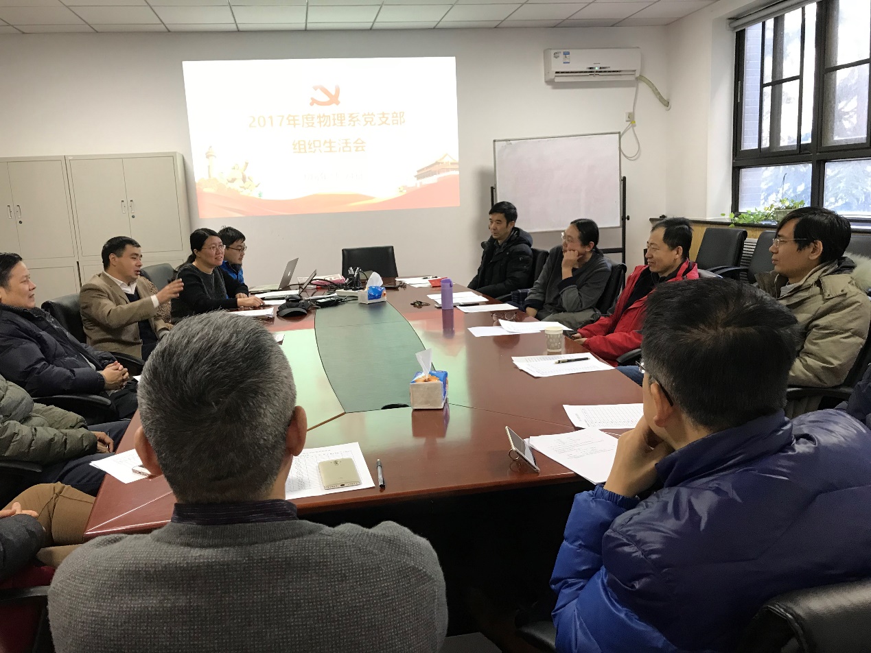 根据中组部《关于召开2017年度基层党组织组织生活会和开展民主评议党员几个问题的通知》文件精神和北航《关于进一步加强和规范党支部组织生活会的意见》、《民主评议党员实施细则》文件要求,在先期学习党的十九大报告和党章的基础上,2018年1月24日,学院物理系党支部在316会议室召开了2017年度组织生活会,主要目的是查摆自身问题,剖析思想根源,开展批评与自我批评。支部成员除5位出差及开会的同志,其他成员全部参加会议。