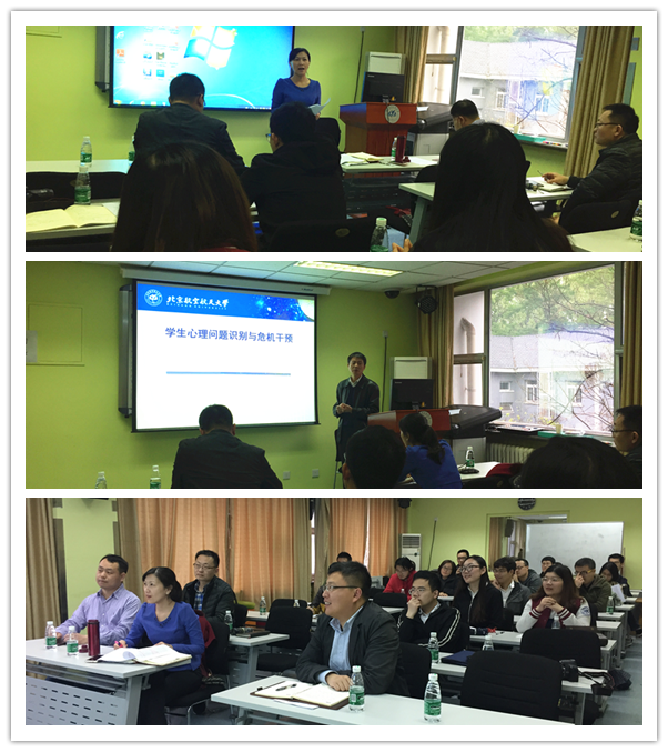 因近期正处于心理问题的高发期,会前,学院党委组织全体党支部书记到大学生心理咨询与发展辅导研究中心参观学习,提高为学生健康成长和全面发展的保障能力。心理咨询中心主任马喜亭老师带领大家参观了心理咨询中心各室,详细讲解了各项服务设施的功能及其使用情况并欢迎大家来咨询或体验。随后,马老师给大家作了题为《学生心理问题识别和危机干预》的专题讲座。马老师强调了高校心理健康教育和心理危机识别与干预的的重要性和紧迫性,从常见心理问题识别与干预策略讲起,告诉大家如何发现危机、如何及时干预和怎样帮助学生。“有时去治愈,常常去帮助,总是去安慰”,马老师最后的赠言引发了与会师生的深思。支部书记将充分发挥党支部在日常学习生活中的战斗堡垒和桥梁纽带作用,关心支部党员和群众,及时发现问题、提供或寻求帮助,并注重营造积极乐观向上的氛围,为同学们的健康成长保驾护航。