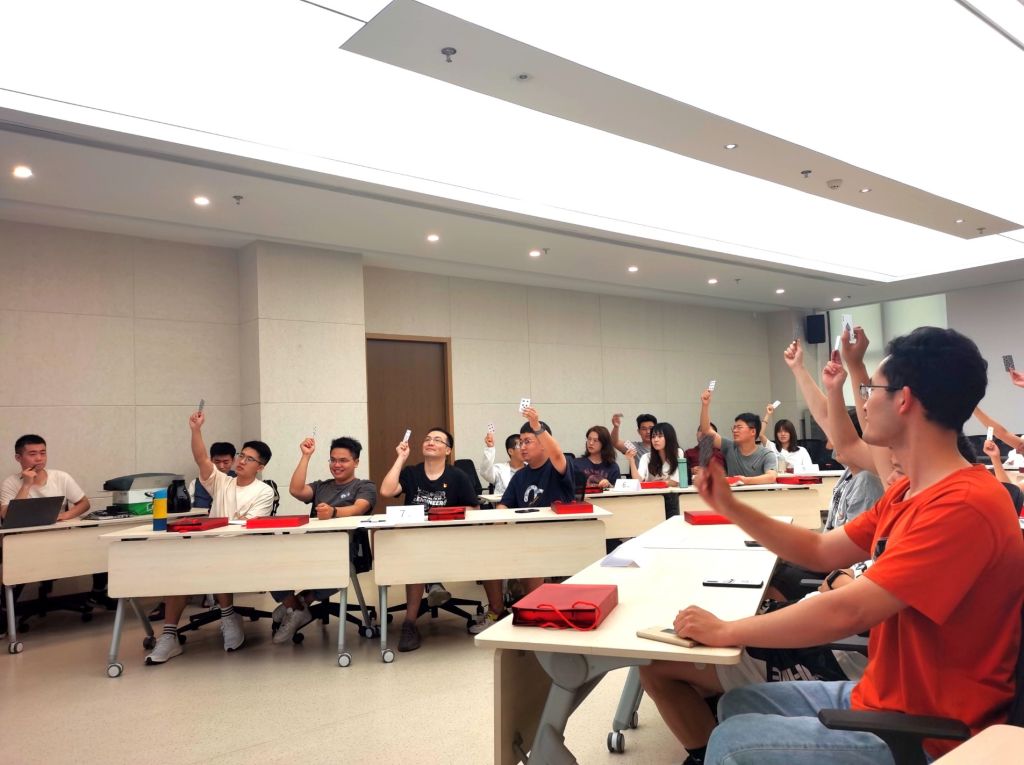 活动伊始,两支部参赛党员同志现场组队,每队4人,题型包含必答题、抢答题、连线题、风险题和互动题,不同题型,作答方式不同。答题所获得/扣除分数,根据不同题型、不同算法,计入到个人成绩和总成绩中,最后获得计分排名。两支部成员们认真听取规则,积极探讨“战术”。为便于记录个人成绩,每位参赛选手均手持一张题签。在答题期间,举手牌示意选择A、B、C、D哪一选项。