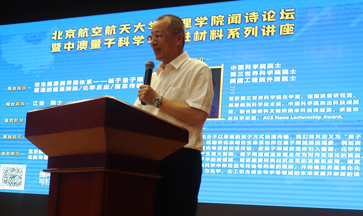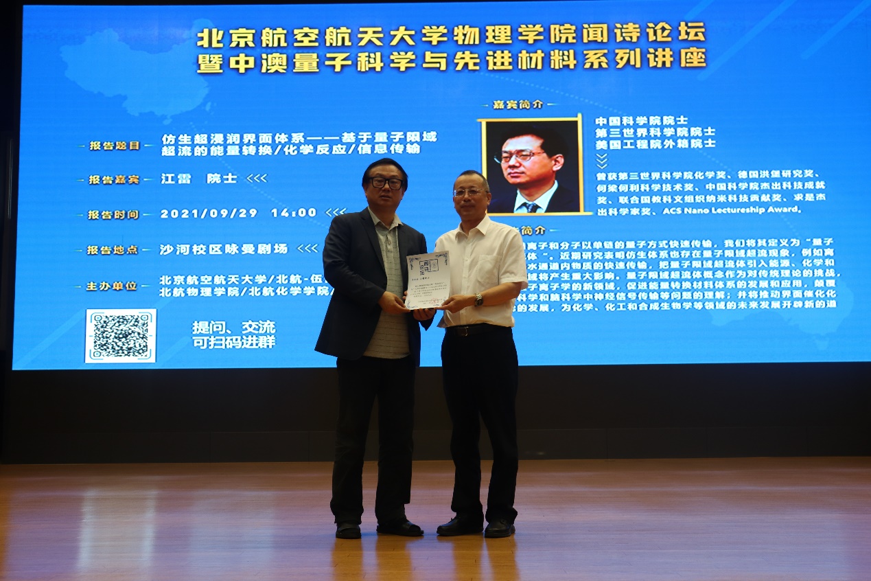 2021年9月29日下午,pg娱乐电子游戏官网入口在沙河校区咏曼剧场成功举办“中·澳量子科学与先进材料系列讲座第三讲”暨“闻诗论坛第八讲”。本次论坛有幸邀请中国科学院院士、第三世界科学院院士、美国工程院外籍院士江雷教授作为主讲人。